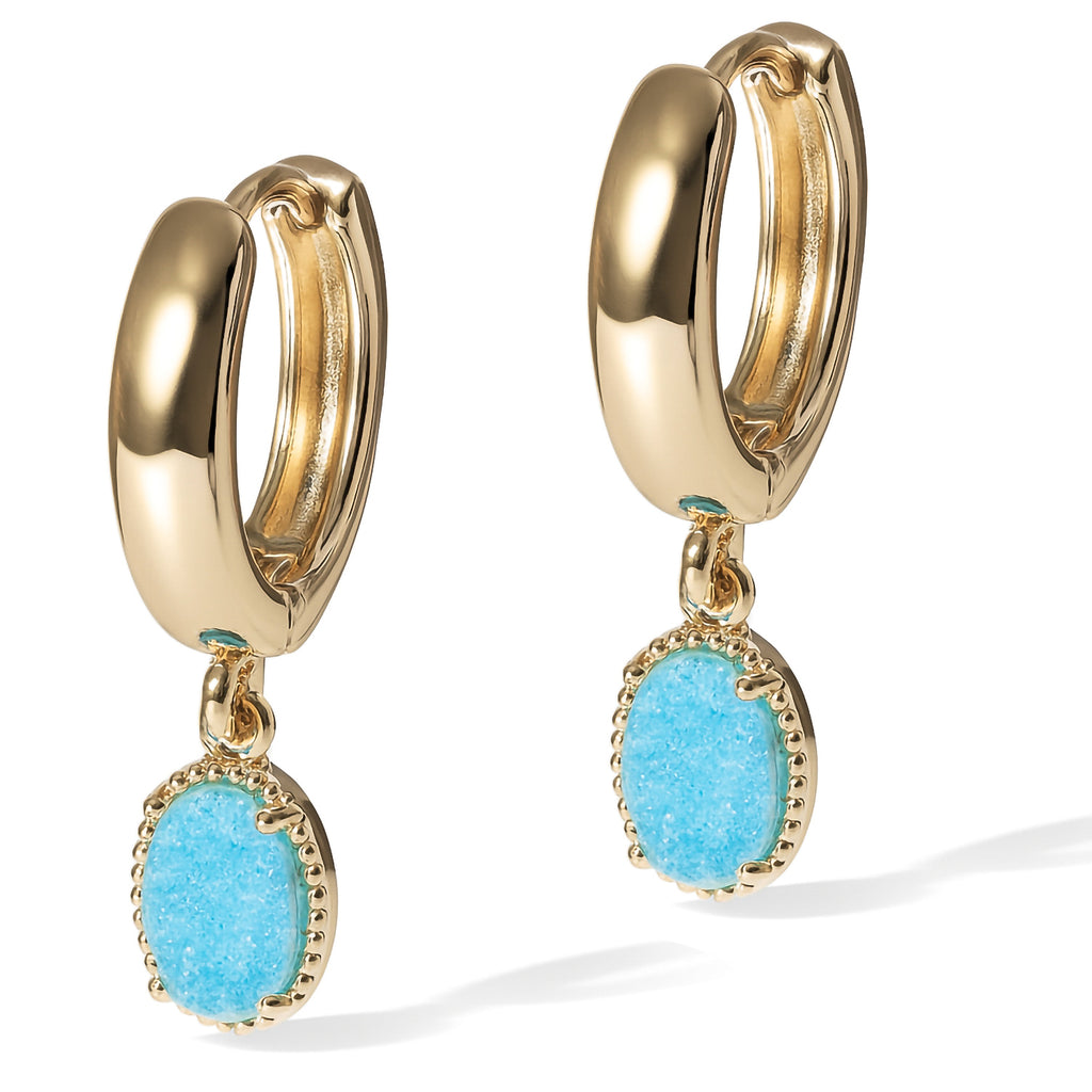 Sommerlicher Luxus in strahlendem Gold: Die glänzenden Creolen tragen einen funkelnden Türkis-Anhänger, der wie ein Stück des klaren Meeres in der Sonne leuchtet. Umrahmt von filigranen Goldperlen, entfaltet der Stein seine lebendige Farbintensität und verleiht jedem Look eine erfrischende Leichtigkeit. Perfekt für alle, die zeitlose Eleganz mit einem Hauch von Urlaubsgefühl verbinden möchten.